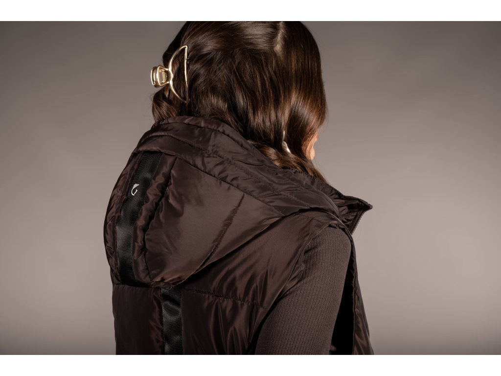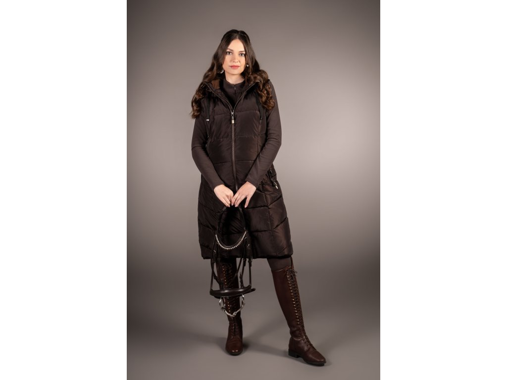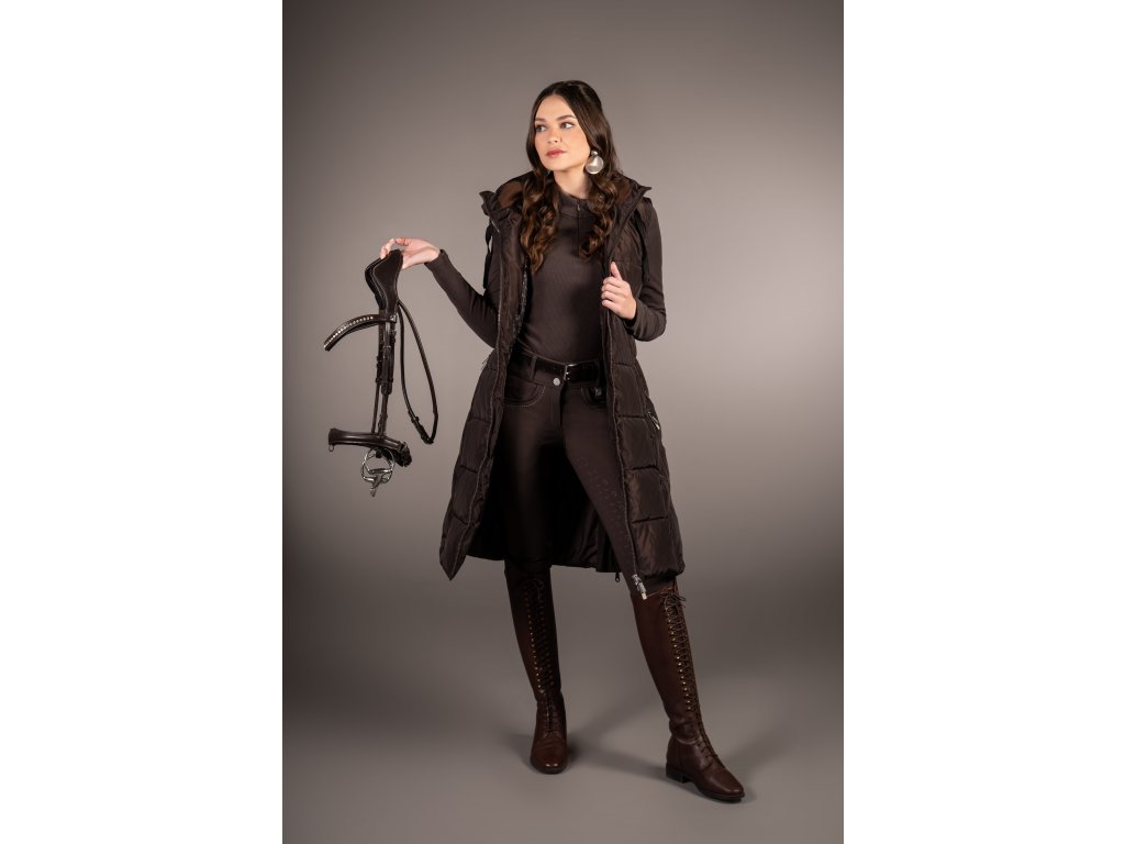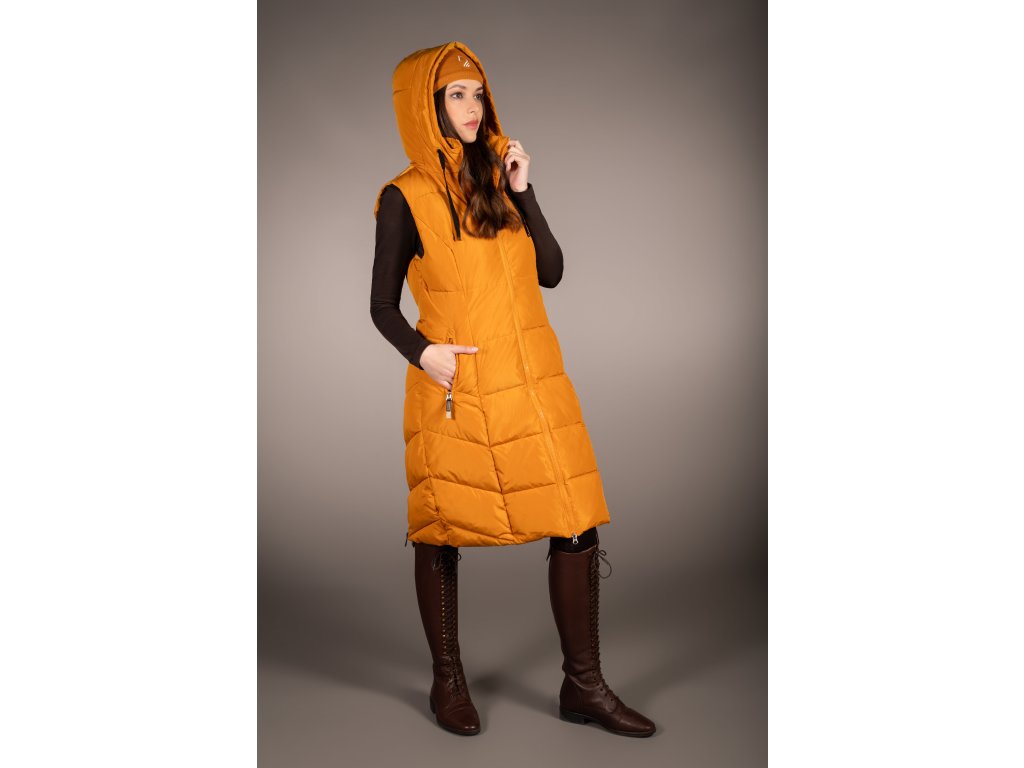 Velmi teplá, ale lehká, dlouhá, prošívaná vesta s jezdeckými rozparky. Vesta Arezzo je s voděodolnou úpravou, má dvoucestný zip a dlouhý rozparek s reflexním proužkem (na fotografiích je původní verze s dvěma rozparky, nová verze má rozparek jeden uprostřed). Kapuce je velká stejné jako dvě přední kapsy na zip. propracované moderní detaily a funkčnost předurčují vestu nejen do sedla ale i na běžné nošení.