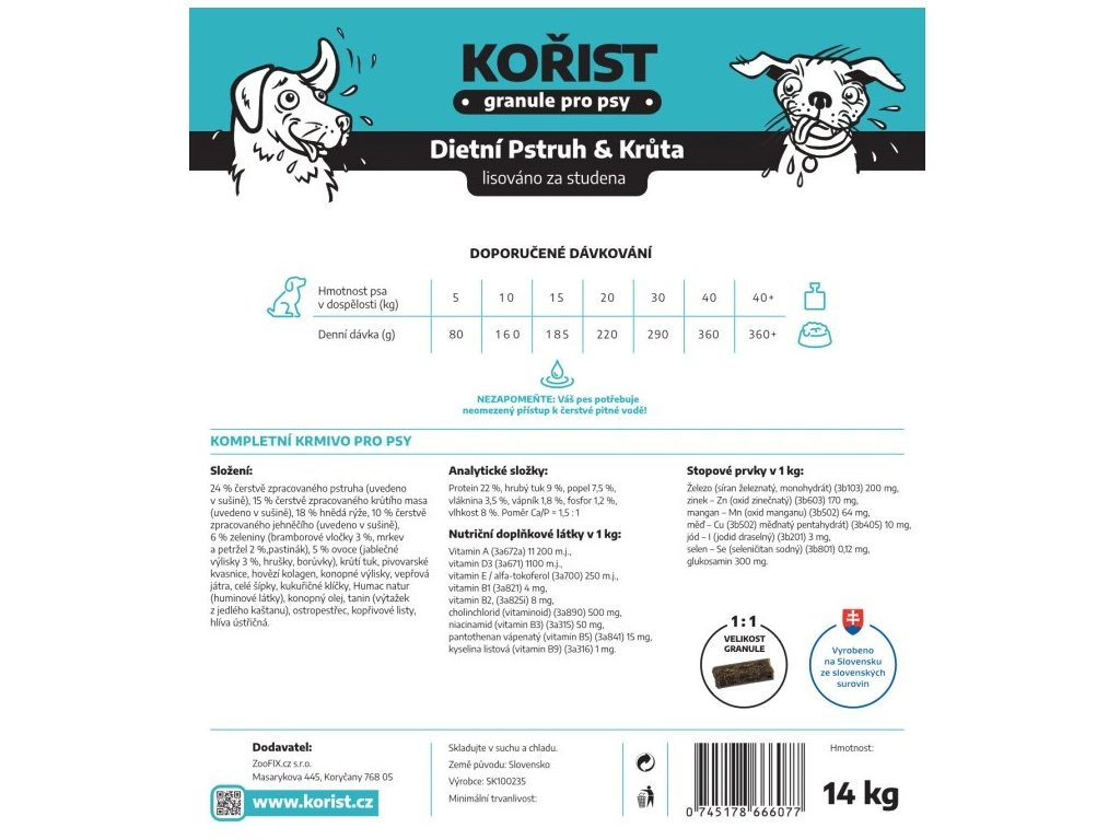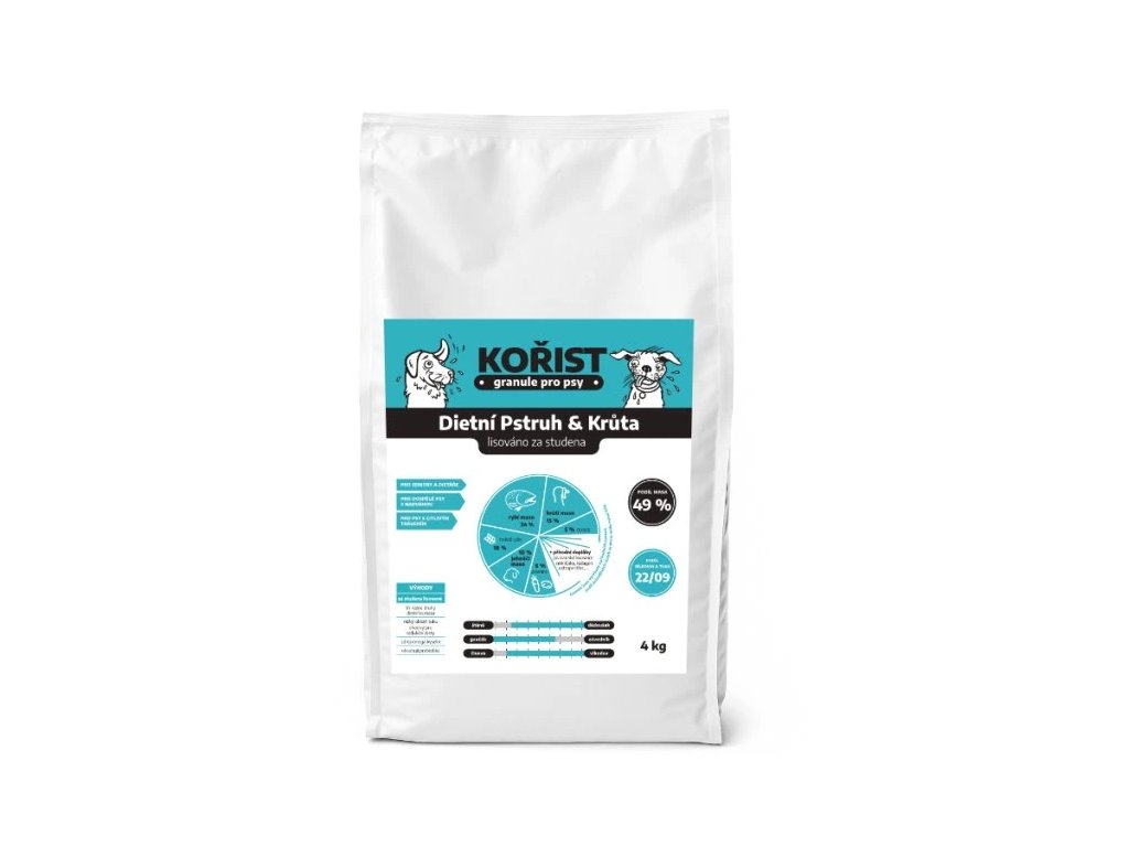 Granule Kořist Dietní Pstruh & Krůta - každá složka v receptuře má svůj smysl – podporuje trávení, klouby, srst, imunitu i celkovou pohodu. Díky šetrnému lisování za studena si zachovávají maximum živin a přirozenou chuť, kterou psi milují: