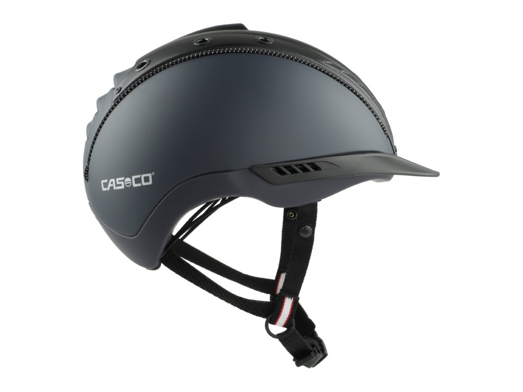 Luxusní jezdecká přilba v elegantním matném, tmavě šedém provedení a středovým panelem ve vzhledu karbonových vláken.'Materiál středu je odolný poškrábání.