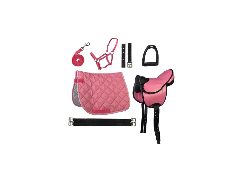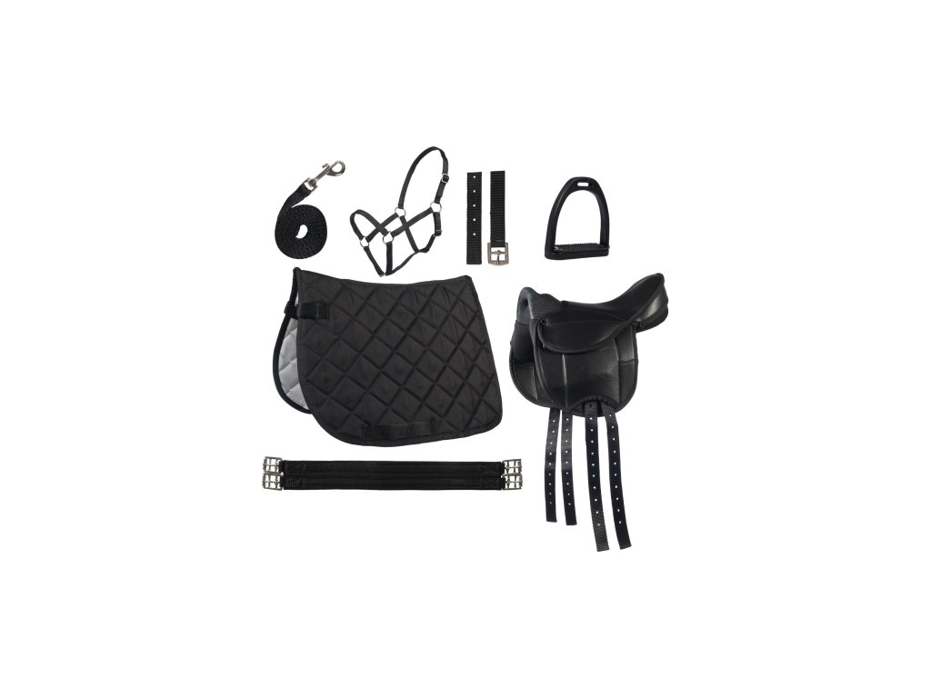 Základní sada pro malé poníky a jejich malé jezdce. Komplet osahuje sedlo, podbřišník, podsedlovou dečku, třmeny a třmenové řemeny, ohlávku a vodítko. Vše ve velikosti Shetty. Sedlo v imitaci kůže.