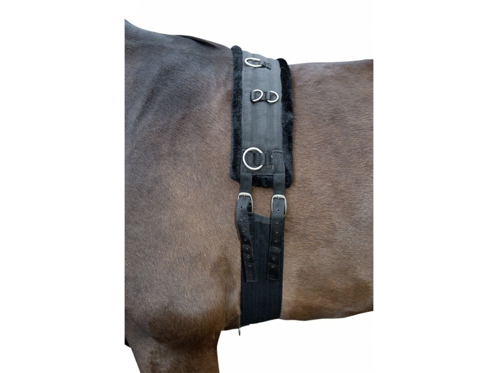 Nylonový obřišník s velkým množstvím kroužků pro individuální nastavení pomocných otěží.Fleecová podšívka z umělého beránku v horní části s vyztuženými polštáři (neleží na kohoutku). Obřišník je nastavitelný na obou stranách.