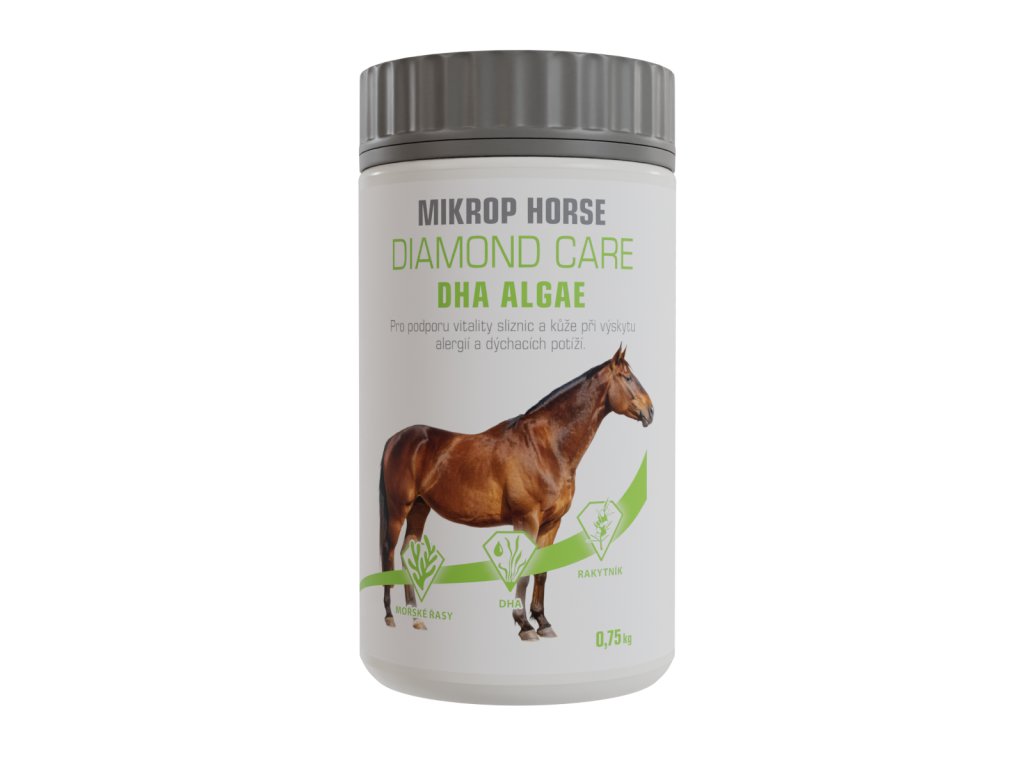 Doplňkové krmivo pro koně Mikrop® Horse Diamond Care DHA Algae obsahuje přirozený zdroj DHA – mořskou řasu rodu Schizochytrium spp. Tato řasa se vyskytuje převážně v chladných severských mořích, a kromě vysoké koncentrace DHA obsahuje další tělu prospěšné látky, jako jsou omega-3 a omega-6 mastné kyseliny a antioxidanty. Zařazení DHA do krmné dávky je doporučeno v případech zvýšeného stresu organismu, např. při zvýšené námaze, po sportovním výkonu, nebo při průběhu zánětlivých procesů, jako jsou různé alergické reakce, bolestivost pohybového aparátu, žaludeční vředy, EMS a další. DHA je vhodné podávat i koním v chovu – klisnám pro podporu reprodukčního cyklu a hřebcům pro podporu spermatogeneze. Receptura dále obsahuje zdroje přírodních antioxidantů, jako je rakytník a červený rybíz, přípravek je také obohacen o silný antioxidant vitamín E a vitamín C. Antioxidanty chrání buňky před poškozováním, čímž podporují zdraví tkání sliznic, kůže a jiných orgánů. Pro nejlepší výsledky podávejte alespoň 2−3 měsíce.