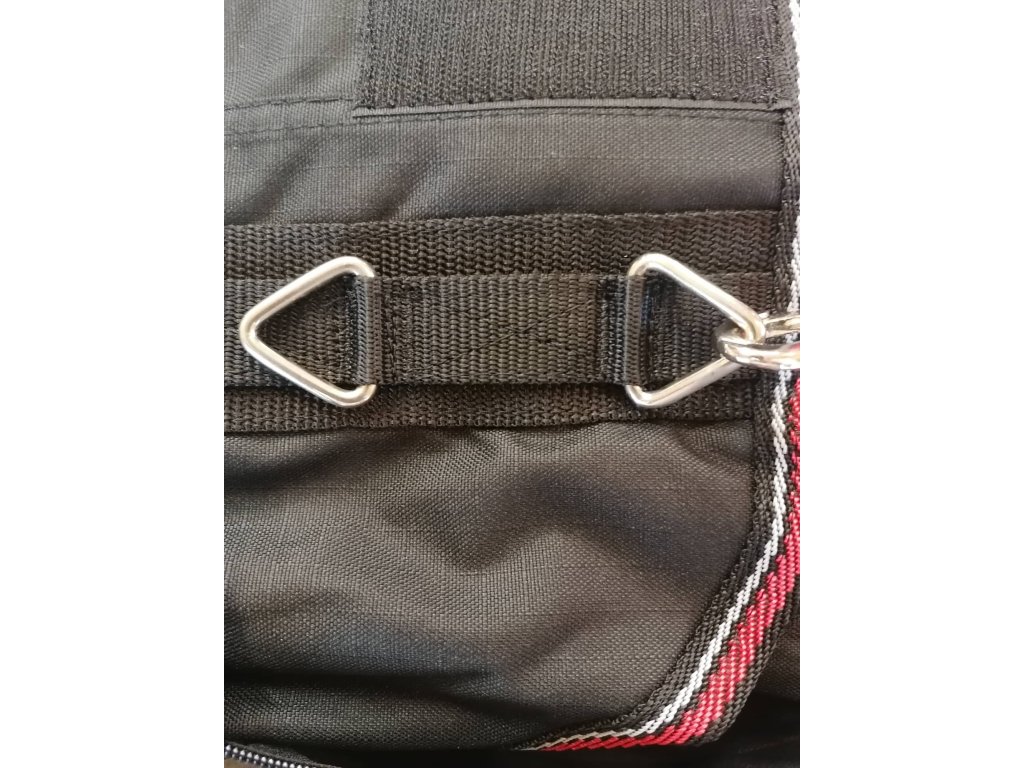 V předu zapíníní na karabiny, křížové zapínání pod břichem i meza zadníma nohama.