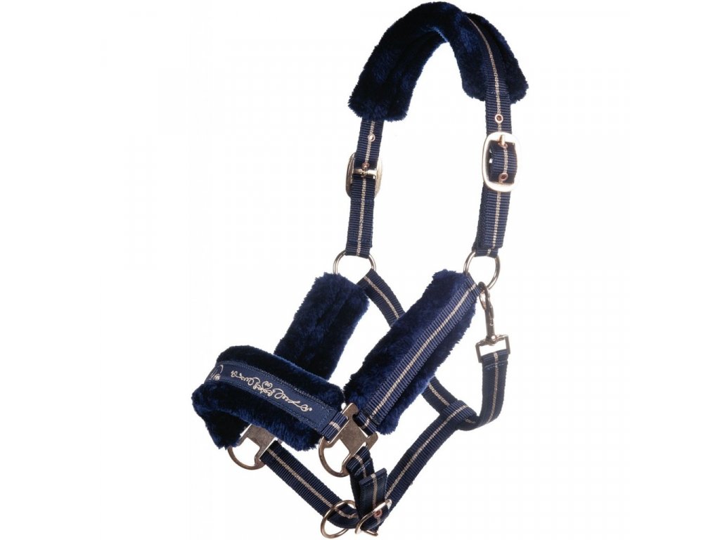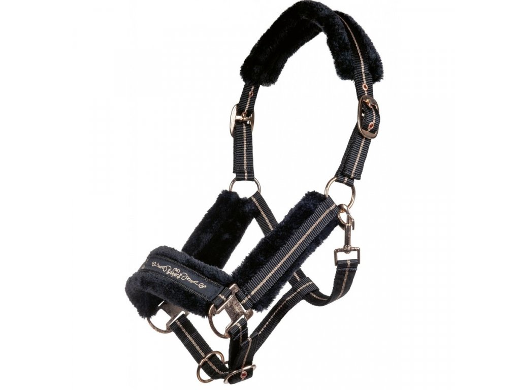 Velmi elegantní ohlávka s vyšívaným nánosníkem. Lícnice, nánosník i nátylník jsou podloženy měkkým umělým beránkem. Kvalitní kování v barvě rosegold. Ohlávka je stavitelná na nánosníku a na obou stranách nátylníku.