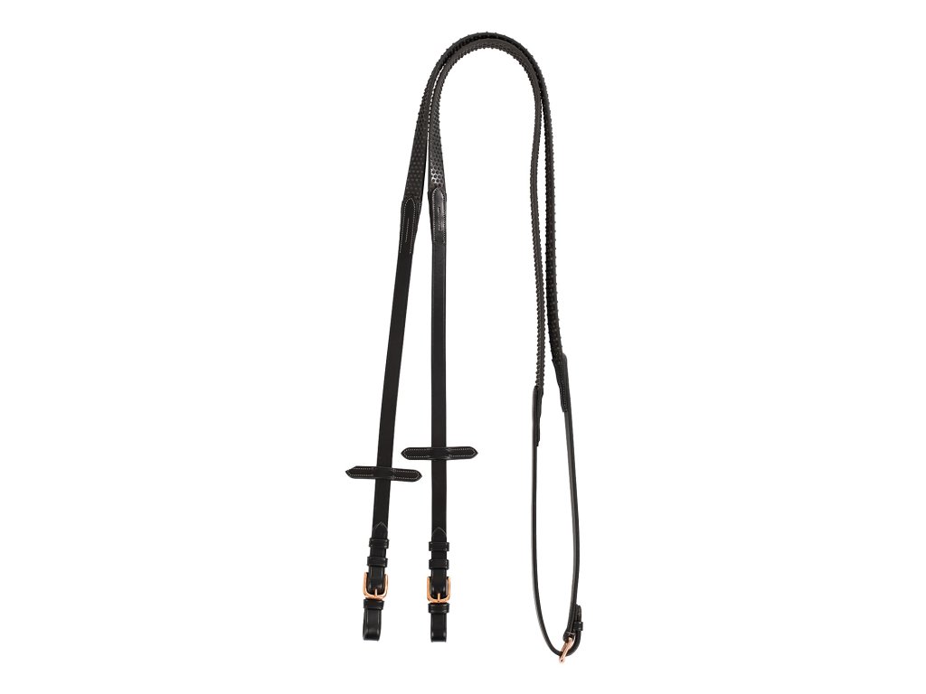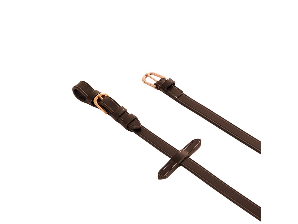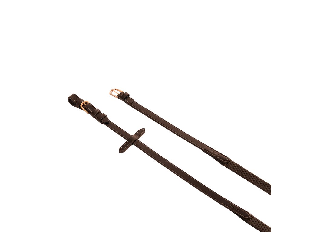 Luxusní gumové otěže z prvotřídní italské kůže s kováním v rosegold barvě. Otěže jsou velmiměkké a příjemné do ruky. Ladí s uzdečkou Equestero rosegold.