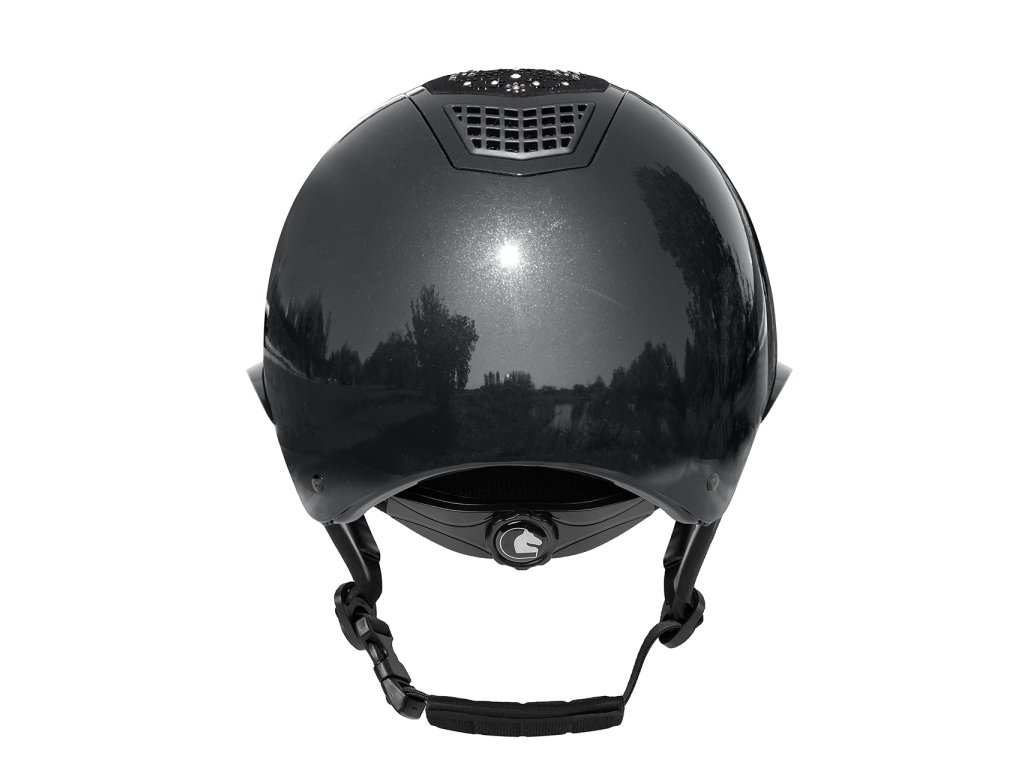 Moderní, vzdušná a komfortní bezpečností jezdecká přilba v krásném designu s hladkým, lesklým povrchem s metalickými odlesky a středovým pruhem s třpytivými kamínky na semišovém povrchu.