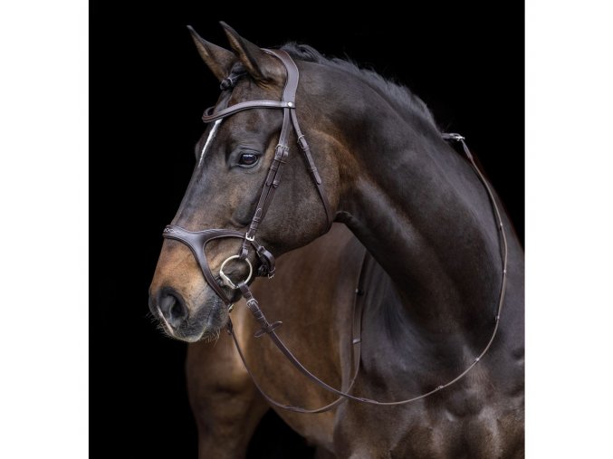 Krásná uzdečka z prvotřídní měkké kůže s anatomicky řešeným nánosníkem. Uzdečka omezuje tlak an citlivá místa na nose koně. Uzdčka má rozčířený, měkčený nánosník a je dodávána včetně plátěných otěží se zarážkami.
