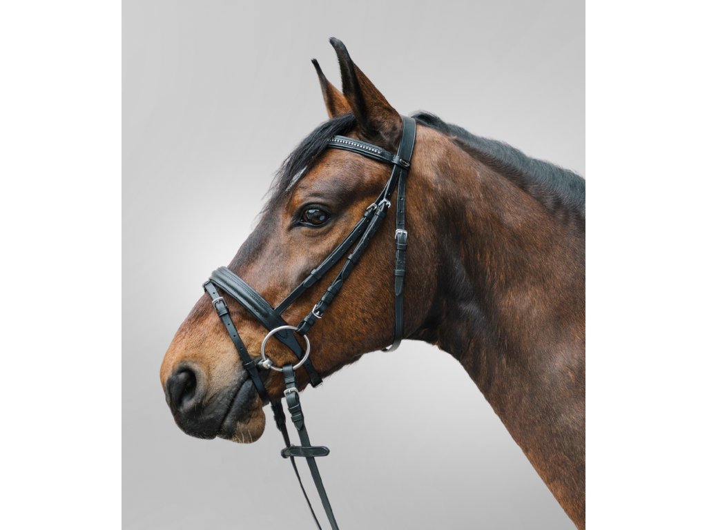 Uzdečka z kvalitní kůže, s čelenkou zdobenou bílými kamínky Swarovski. Včetně plátěných otěží.