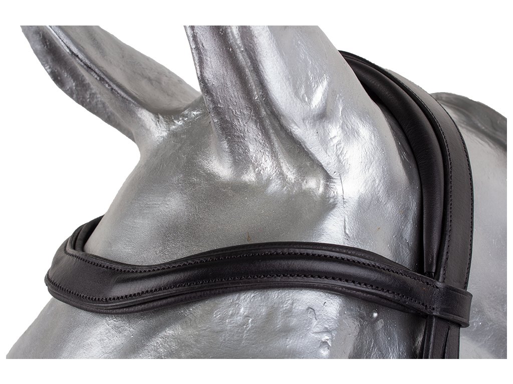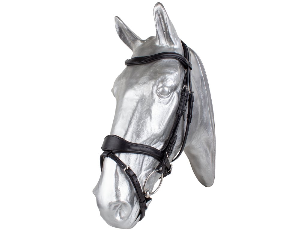 Uzdečka s širokým anatomicky tvarovaným a velmi měkce podložený nátylníkem. Anglický kombinovaný nánosník s rozšířeným středem pro lepší rozložení tlaku na nos koně. Dodáváno včetně plátěných otěží se zarážkami.