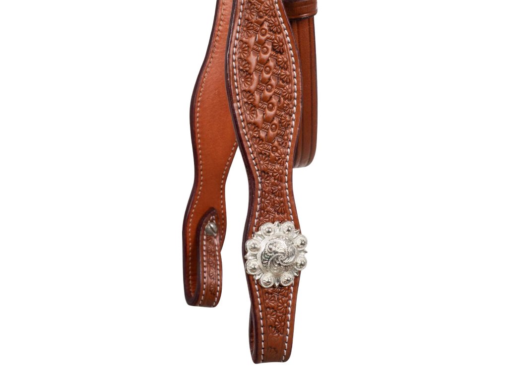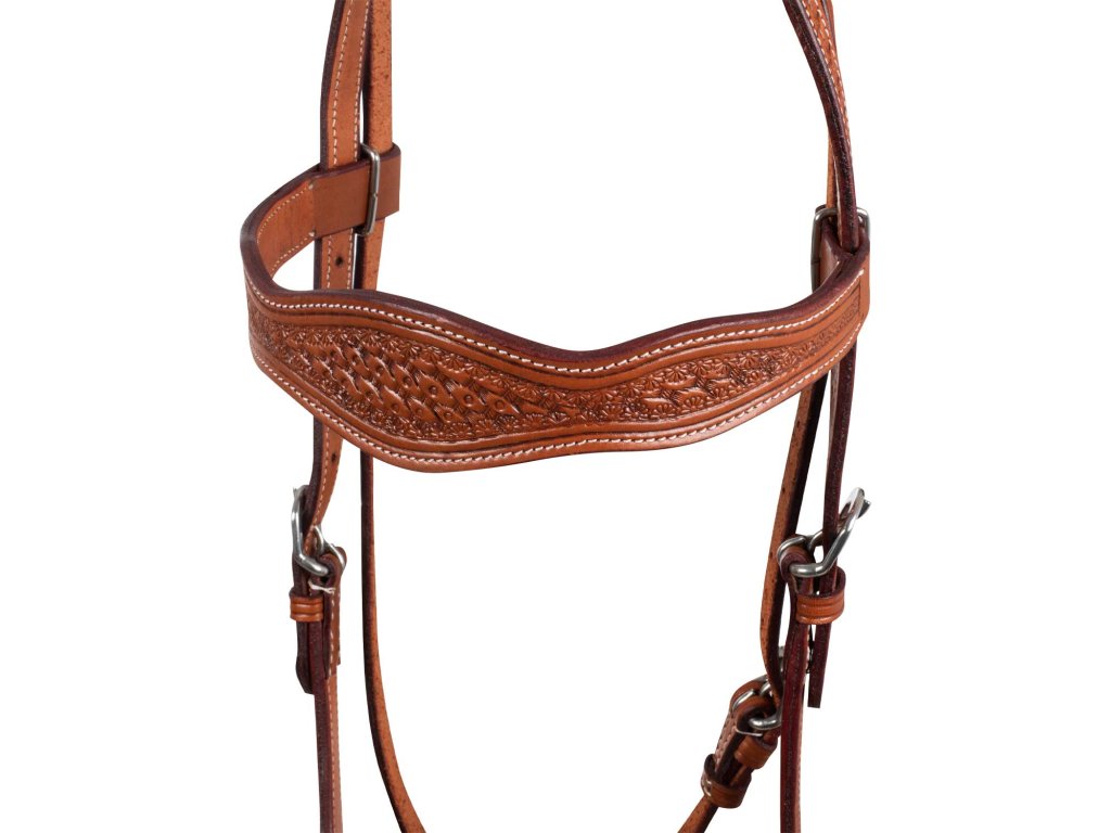 Kvalitní kožená westernová uzdečka s jemným vytlačovaným dekorem basket a kvítků. Barva kůže chestnut (kaštanová hnědá).