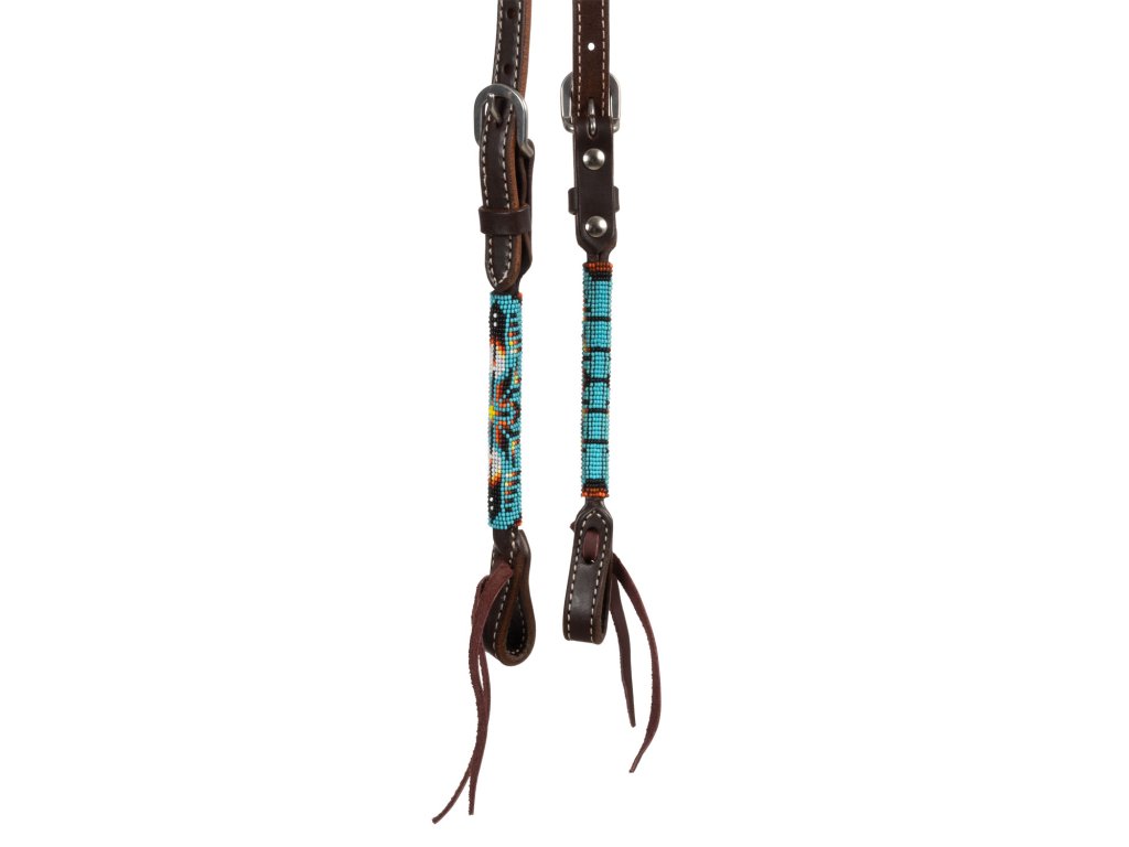 Krásná westernová uzdečka na jendo uch z měkké, olejované kůže. Uzdečka je zdobena korálky na lícnicích i na uchu. Zapínaání lícnic je stavitelné na obou stranách uzdečky. Zapínání k udidlu na jendouché provlečení kožených řemínků.