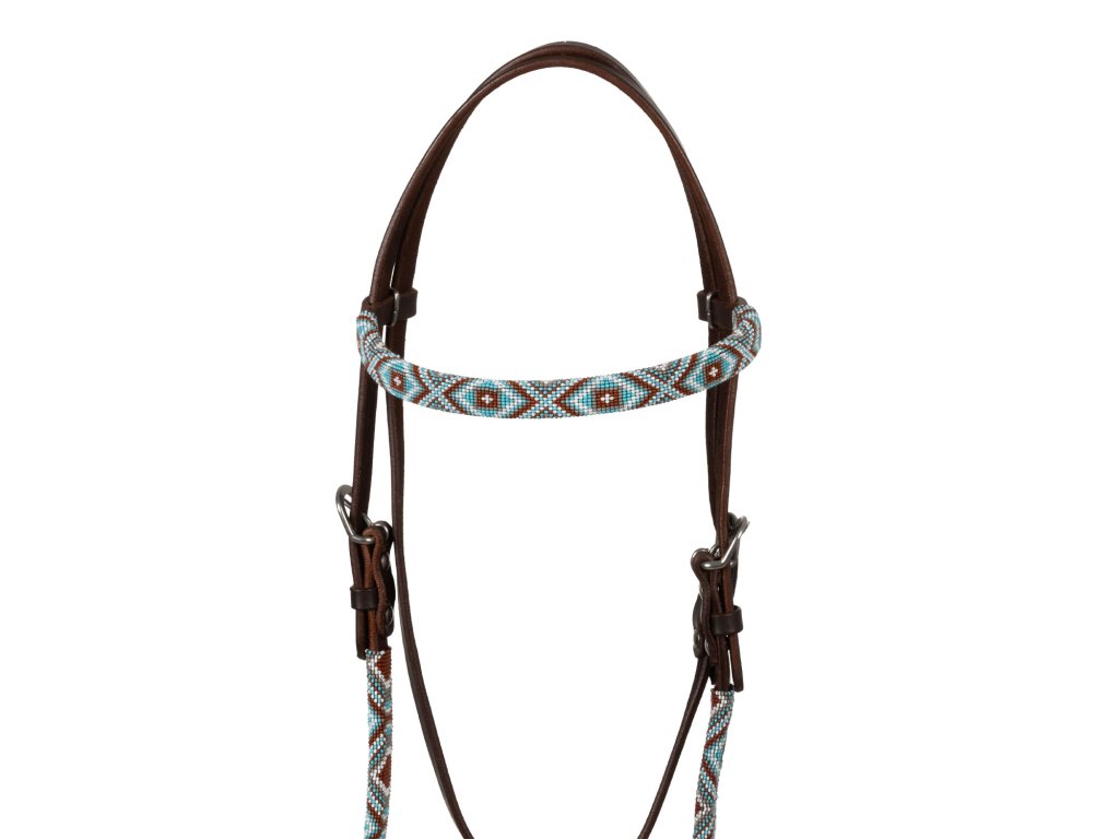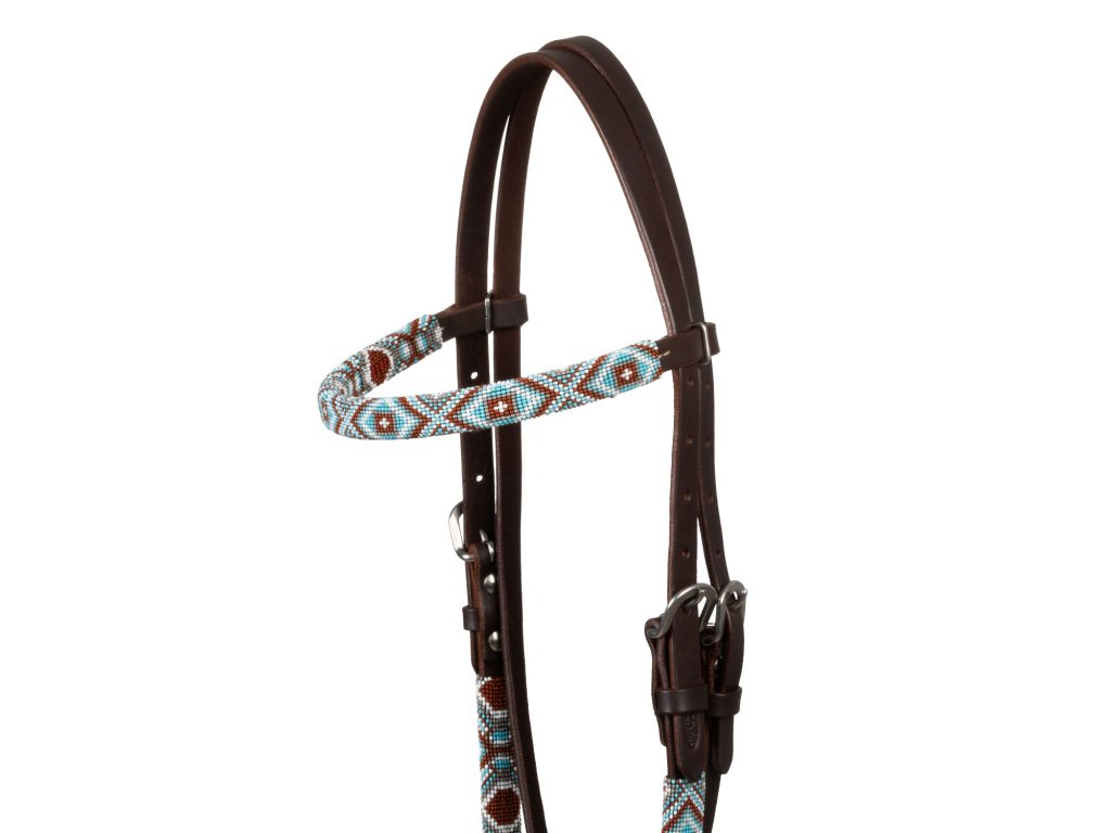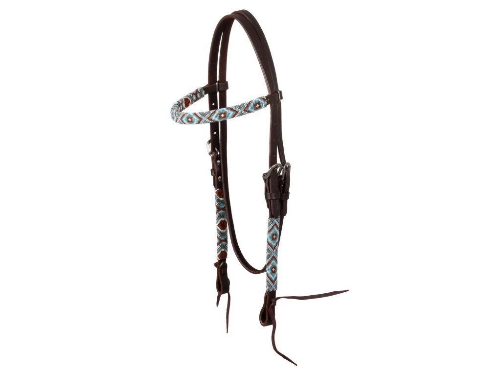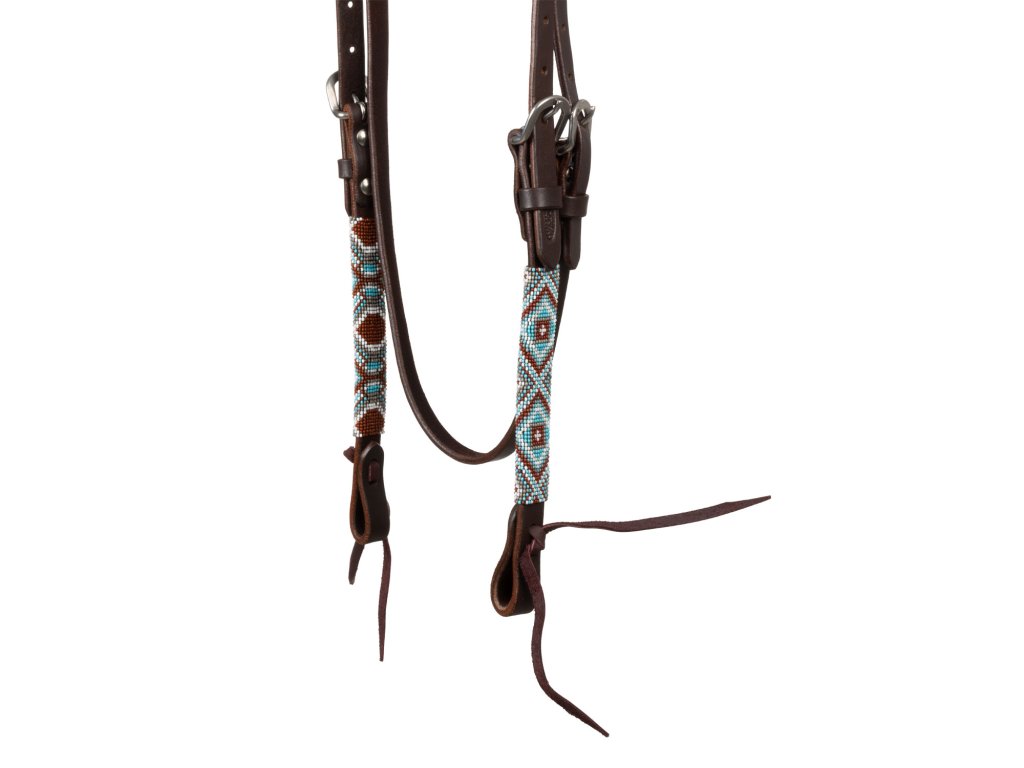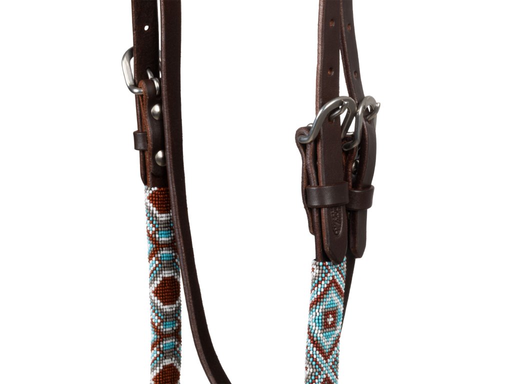Krásná westernová uzdečka z měkké, olejované kůže. Uzdečka je zdobena korálky na lícnicích a na čelence. Ozdobu tvoří i konnčo na jedné straně čelenky. Zapínání lícnic je stavitelné na obou stranách uzdečky. Zapínání k udidlu na jednoduché provlečení kožených řemínků.